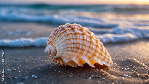 Seashell on Sandy Beach at Sunset with Gentle Ocean Waves