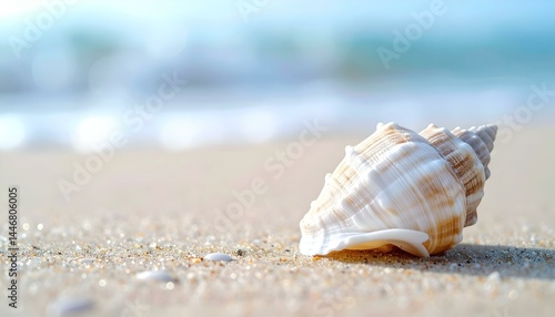 Seashell on sandy beach, ocean background. Perfect for summer, vacation, travel themes.