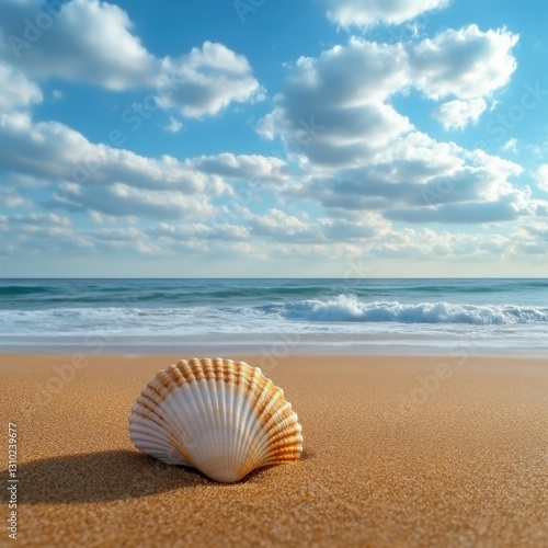 Seashell resting on sandy beach with waves gently crashing under a bright sky