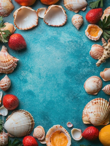 seashell, strawberry, lemon, seafood, fruit, plate, decorative, shell, collection, food, photo, colourful, life, summer, beach, theme, marin, art, table, setting, fresh, sandy, background, luxurious, arrangement, tropical, motif
