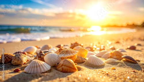 beach, seashell, sunset, ocean, wave, sand, gold, sunlight, summer, calm, tranquil, warm, shore, seacoast, coast, seascape, sunrise, shell, marin, nature, beauty, idylli, peaceful, horizon, colourful, golden hour, ocean view, relaxing, vacation, travel, summer, holiday, paradise, coastal, tour tourism, relaxation