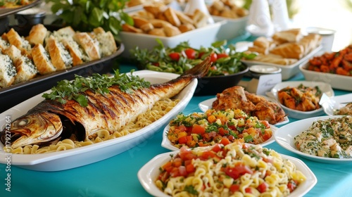 Seaside lunch spread, charred whole fish, fresh herb garnishes, crisp vegetable salads, crusty bread selection, pasta with meat sauce, creamy skillet chicken, ceramic dinnerware, turquoise linen