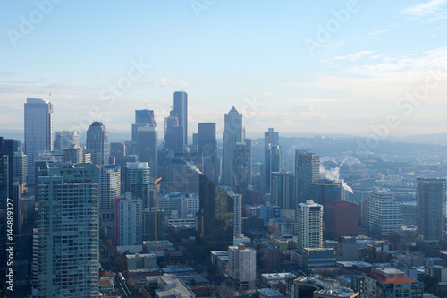 SEATTLE, WASHINGTON, USA - JAN 23rd, 2017: skyline of downtown Seattle, view from the top of the Space Needle during a cloudy day
