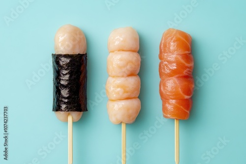 Seaweed Wrapped Mochi Balls, Grilled Fish On Sticks, Japanese Food