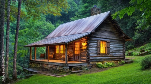 cabin, log cabin, wood, forest, tree, nature, rustic, home, house, countryside, evening, dusk, night, serene, peaceful, tranquil, cosy, comfortable, relaxing, quiet, solitude, escape, retreat, idylli, charming, picturesque, scenic, beautiful, landscape, timberland, rural, illuminated, window, porch, stone, grass, green, warm, lighting