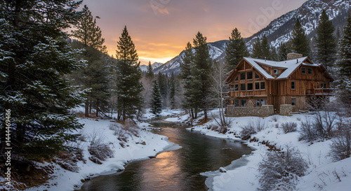 winter, cabin, mountain, sunset, snow, river, forest, landscape, filed, nature, tree, cold, sunrise, scenic, timberland, sky, building, house, residence, home, wood, chalet, frost, ice, countryside, nobody, travel, holiday, vacation, winterly, snowy, season, environment, creek, stream, waterscape, pine, fir, architecture, real estate, dwelling