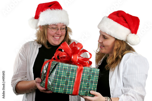 people, person, woman, woman, girl, children, teenage, teenage, teenage, young, youth, youthful, adult, holiday, seasonal, season, christmas, christmas, celebrate, celebration, gift, present, exchange, open, paper, enclosed, wrapped, wrapping, bow, green, red, ribbon, morning, eve, santa, hat, clause, give, giving, sister, family, friends, event, party, surprise, surprised, secret, office, work, workplace, job, co-worker
