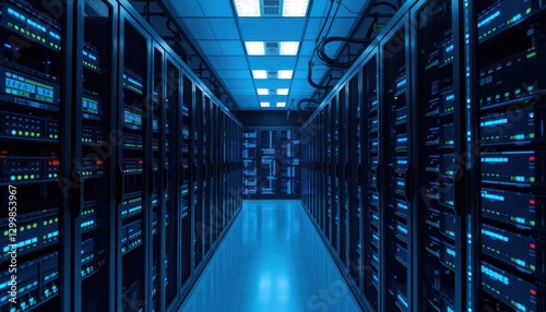Secure server room operations data center technology infrastructure high-tech environment wide angle digital security