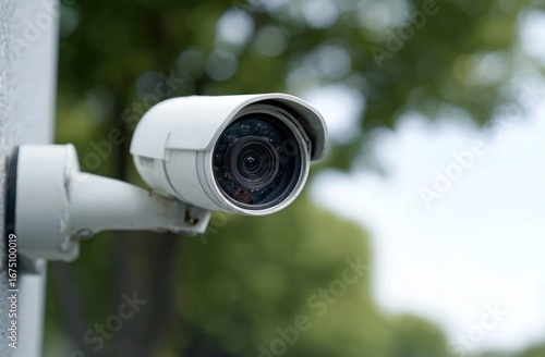 camera, security, surveillance, mounted, wall, white, lens, technology, close, view, sharpened, digital, grey, tree, green, blurred, background, daylight, concrete, metal, fixed, monitoring, safety, protection, image, device, exterior, detail, modern, viewpoint, observation, prevention, equipment, watchful, guarded, system