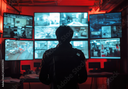 Security guard observes numerous surveillance screens in a control room filled with low red lighting and ambient computer sounds