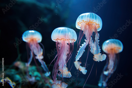 See life macro concept. beautiful space purple jellyfish on dark background in the sea. Vivid Wildlife elements