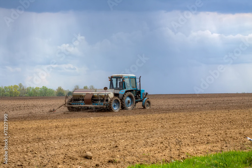 tractor, seeding, field, dirtied, agriculture, agricultural, farm, farming, farmer, machine, machinery, equipment, blue, cultivation, cultivating, cultivated, land, rural, work, season, seasonal