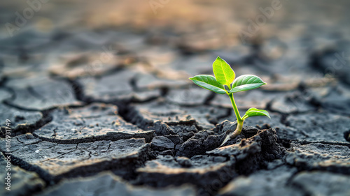 Seedling Growing in Parched Soil at Sunset. A young plant emerges from cracked, dry soil under a golden sunset, symbolizing resilience and new beginnings.
