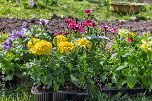 dahlia, glasses, marigold, petunia, pink, annual, background, bloom, blooming, blossom, blossoming, botanical, botany, bright, brown, carnation, cassette, closeup, closeup, clove, colourful, decorative, flora, floral, flourish, flourishing, flower, gardening, grass, green, growing, herbaceous, lawn, nobody, orange, ornamental, plant, plastic, red, thyme, tray, white, yellow
