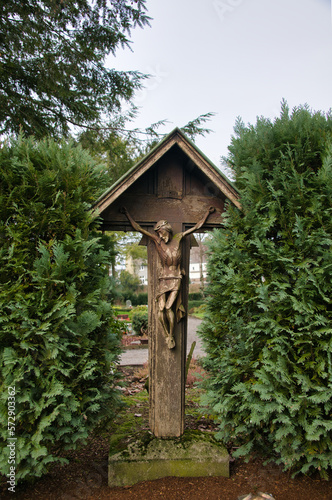 sehr altes überdachtes Holzkreuz auf einem Friedhof in Velbert