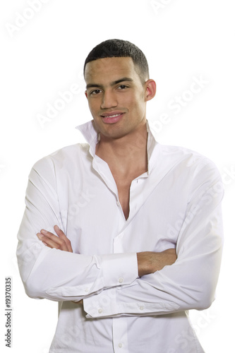 man, young, attractive, self-assured, cool, model, fashionable, extreme, sensual, care, fashion, coiffure, breast, portrait, face, dark, afrikaner, africa, culture, coloured, skin, person, man, male, people, isolated, release, white, background, shirt, dandy, beauty, pretty, arm