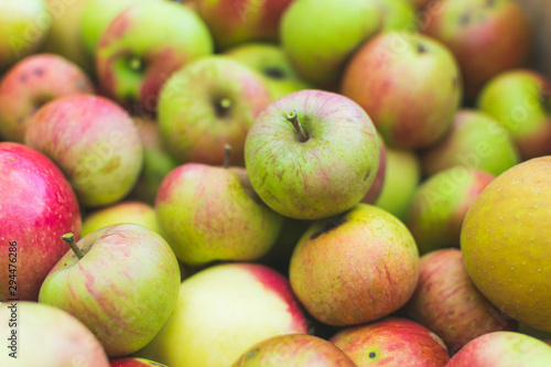 Selective focus and full frame photo of colorful apples freshly picked from orchard