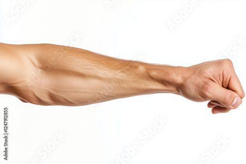 Selective focus bodybuilder arm with strong muscular isolated on white background, Muscle man with stretch forearm.