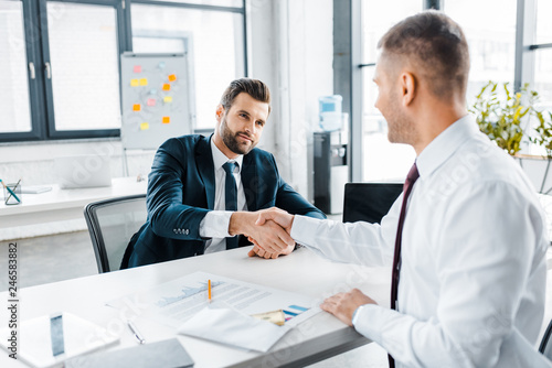 paper, business, financial, adult, people, caucasian, male, modern, man, office, working, work, document, desk, together, togetherness, indoor, finance, profession, photogenic, workplace, workspace, handshake, meeting, businessman, businessperson, deal, diagram, colleague, co-worker, bearded, graph, professional occupation, selective focus, shaking hands