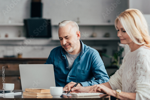 selective focus of cheerful man sitting and looking at laptop near attractive blonde wife