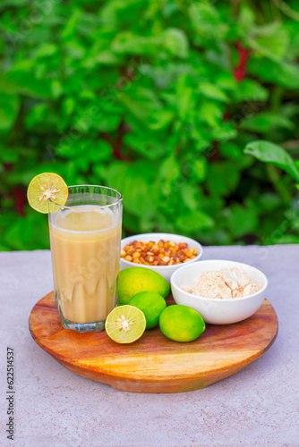 selective focus of delicious healthy drink "Sattoo" is made of gram powder.