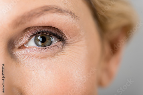 beautiful, beauty, caucasian, eye, woman, blond, attractive, mature, partial, cropped, one person, selective focus, closeup, studio shot, middle-aged, part of