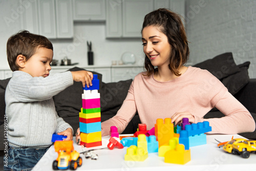 selective focus of mother and little son playing with colorful plastic blocks at home
