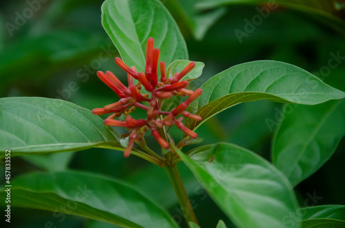 Selective focus on FIREBUSH OR HAMELIA PATENS plant. Red flower and green leaves in morning sunshine isolated with blur background.