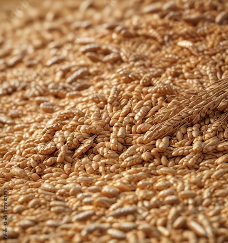 Selective focus on golden wheat grains in a pile, cooking, cereal, baking