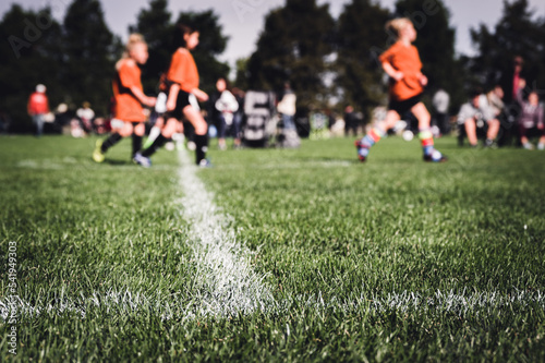 Selective focus on ground level view of soccer field center line with defocused youth girls in background