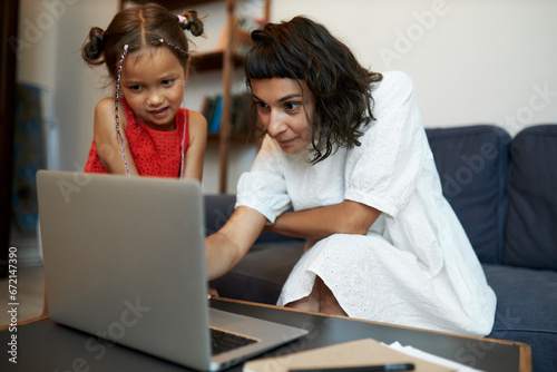 Selective focus on little girl watching her mother working on laptop online as copywriter or blogger, browsing social media, looking at screen with curiosity sitting on couch in front of coffee table