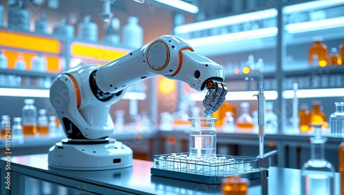 Selective focus on robotic arm in advanced pharmaceutical laboratory for virus research and vaccine development .