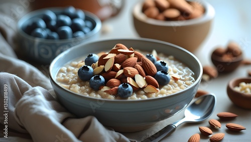 Selenium-Rich Foods:Whole Grains: A cozy breakfast scene featuring a warm bowl of brown rice porridge topped with chopped almonds and fresh berries, with a soft-focus background."