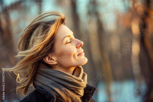 Self healing and spirituality concept with young woman with eyes closed standing with her hair in the wind breeze