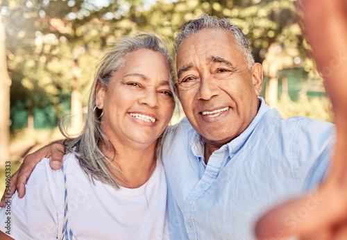 Selfie, portrait and senior couple in a park for love, care and happiness during retirement together. Happy, smile and elderly man and woman with a photo in nature, garden or environment in summer