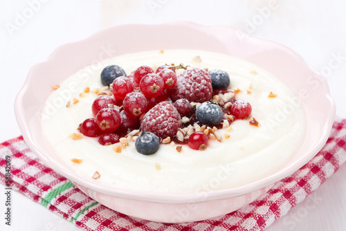 breakfast, semolina, dessert, food, berry, fresh, sweet, healthy, porridge, dairy, eating, cereal, morning, natural, milk, delicious, diet, organic, seasonal, bio, vegetarian, epicure, raspberry, redcurrant, traditional, nut, blueberry, white, bowl, closeup, vitamin, fruit, background, cookery, nourishment, health, mix