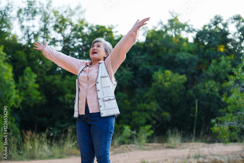 Senior Asian woman travels with close friend after retirement. Elderly women standing arms wide open embracing nature smiling expressing happiness feeling freedom during peaceful outdoor adventure.