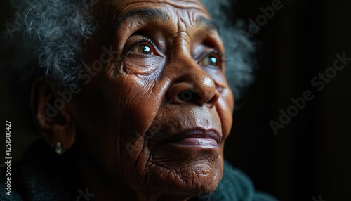 elderly, senior, woman, black, face, portrait, closeup, ageing, old, wrinkle, skin, eye, emotion, wisdom, beauty, person, female, human, looking, hope, dark, head, african, american, ethnic, thoughtful, thought, contemplation, compassion, understanding, connection, healing, love, support, comfort, acceptance, grace, dignity, vulnerable, frail, fragile, humanity, life, event, life events, history, memory, culture, heritage, generation