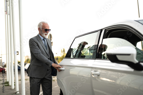 businessman, senior, car, door, opening, car park, executive, transport, transportation, vehicle, suit, attaching, sunglasses, white, elegant, professional, business, travel, arrival, departure, commute, courtesy, service, passenger, ride, offer, assistance, help, gesture, respect, chivalry, manager, leader, entrepreneur, wealthy, successful, achievement, career, lifestyle, city, urban, daytime, modern, automobile, automotive, sedan, luxury