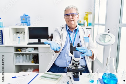 Senior caucasian man working at scientist laboratory smiling cheerful offering palm hand giving assistance and acceptance.