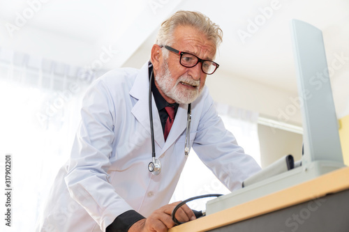 Senior Caucasian professionals doctor checking with blood pressure monitor in hospital room.