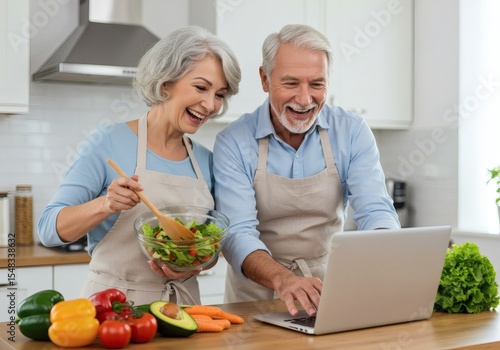 senior, couple, cooking, healthy, food, together, online, receipe, laptop, kitchen, home, smiling, salad, vegetable, apron, wooden spoon, bowl, table, countertop, indoor, happy, lifestyle, nourishment, fresh, ingredient, preparation, pepper, tomatoes, avocado, carrot, lettuce, older, aged, elderly, retirement, husband, wife, human relationships, joyful, cheerful, wellness, diet, dietitian, culinary, domestic, technology, cyberspace