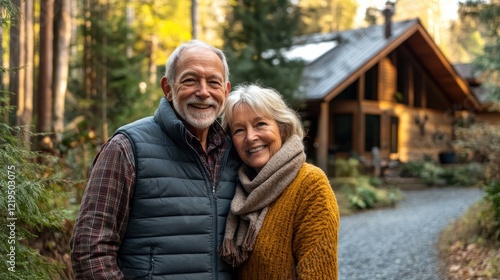 Senior couple enjoying a peaceful moment outdoors in a lush forest setting by a cabin