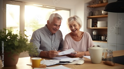 Senior couple going over their bills and home finances while having breakfast in the morning. Generation AI
