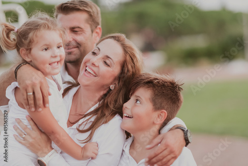 Senior couple in casual clothes with their children spending time in park a vacation together. Family time . Selective focus