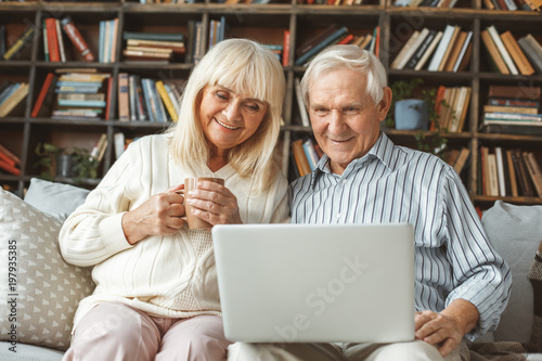 ethnicity, man, male, woman, female, adult, mature, senior, library, living room, love, care, couple, home, caucasian, elderly, retirement, indoor, human relationships, people, wife, lifestyle, closeness, together, portrait, husband, retired, togetherness, old, pensioner, family, life, casual attire, aged, marriage, happiness, leisure, bookshelf, book, sitting, coach, using, laptop, technology, cyberspace, drinking, tea, smiling, logotype