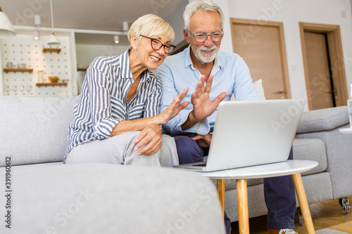 senior, couple, laptop, home, sofa, sitting, looking, video, call, apartment, family, retirement, retired, husband, wife, adult, love, happy, computer, leisure, together, technology, people, lifestyle, cyberspace, casual attire, female, male, life, indoor, caucasian, woman, man, elderly