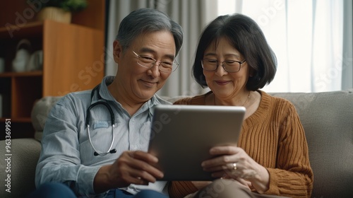 senior, couple, doctor, tablet, technology, health care, home, living room, sofa, retirement, medicals, elderly, digital, cyberspace, happy, smiling, goggles, reading, research, medical professional, care, patient, consultation, check-up, online, communication, connection, human relationships, lifestyle, homecare, medicine, health, assistance, support, remote, virtual, diagnosis, treatment