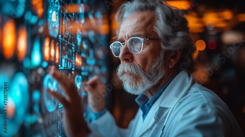 Senior doctor carefully analyzes virtual patient scan on digital screen