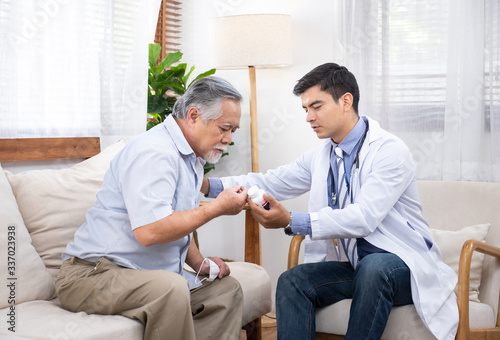 Senior elder asian man asking young caucasian doctor about indications and contraindications of new medicine, healthcare and medicine concept with copy space.